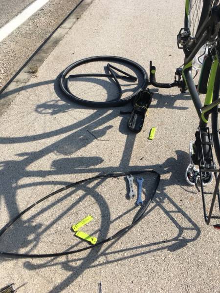 Un raggino rotto significa una ruota che balla e l’antagonista del raggino rotto si romperà a sua volta… Questo vuol dire che bisogna intervenire prima possibile. Ho cercato invano un biciclettaio, ma qui non esiste, sono andato in un’autofficina chiedendo assistenza, ma mi hanno mandato a quel paese.